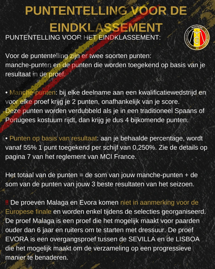 Retrouvez ici toutes les informations sur les prochains concours et activités des Masters du Cheval Ibérique en Belgique. Restez connectés pour ne rien manquer de nos événements à venir !